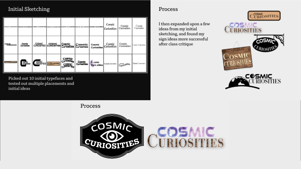 Refinement at this stage was all details. The sign shape was adjusted, lettering and placement were dialed in, and the eye's pupil became a star, a small change that ties 'Cosmic' and 'Curiosities' together. Typeface weight for 'Curiosities' was brought in line with 'Cosmic' for consistency, then spacing was fine-tuned across the mark until the whole thing felt balanced and intentional.
